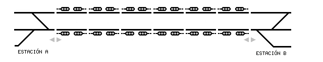 Se trata de una vía doble, en la que los trenes pueden circular por cualquiera de las vías en cualquiera de los sentidos. Podríamos decir que son como dos vías únicas paralelas. O aplicando el símil de la carretera, como si fueran dos carriles reversibles. Con ésto se mejora en mucho la operatividad y capacidad de la línea, puesto que ante cualquier incidencia, o incluso en casos previamente programados, podemos usar las dos vías para hacer adelantamientos, rebases y cruces en plena vía, así como no interrumpir la circulación si ocurre algo, aunque la capacidad se vea limitada. En la mayoría de los núcleos de cercanías está instalado este tipo de vías.Como podéis ver en la imagen, en un BAB se trata de dos vías únicas paralelas con toda su señalización asociada. Así los trenes pueden circular en cualquiera de los sentidos por cualquiera de las vías. Este tipo de bloqueo es el más presente en núcleos de Cercanías, pero también hay de los otros.